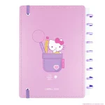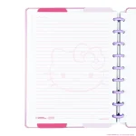 Cada página é decorada com detalhes temáticos da Hello Kitty, como a personagem e linhas rosa, tornando suas anotações mais alegres e inspiradoras.