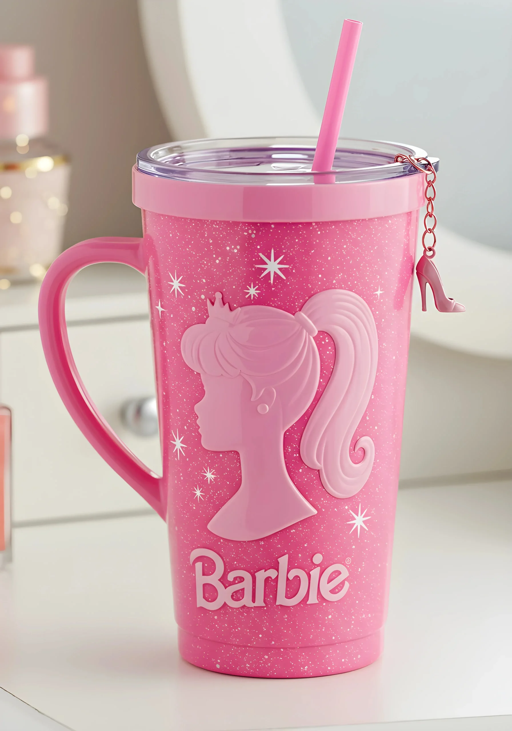 ✨ Estilo, brilho e atitude! O Copo Térmico Barbie é a definição de glamour. Com glitter na superfície, um relevo elegante da silhueta da Barbie e um pingente em forma de salto alto, ele é feito para quem ama moda, tendências e quer se destacar em qualquer lugar. 💖