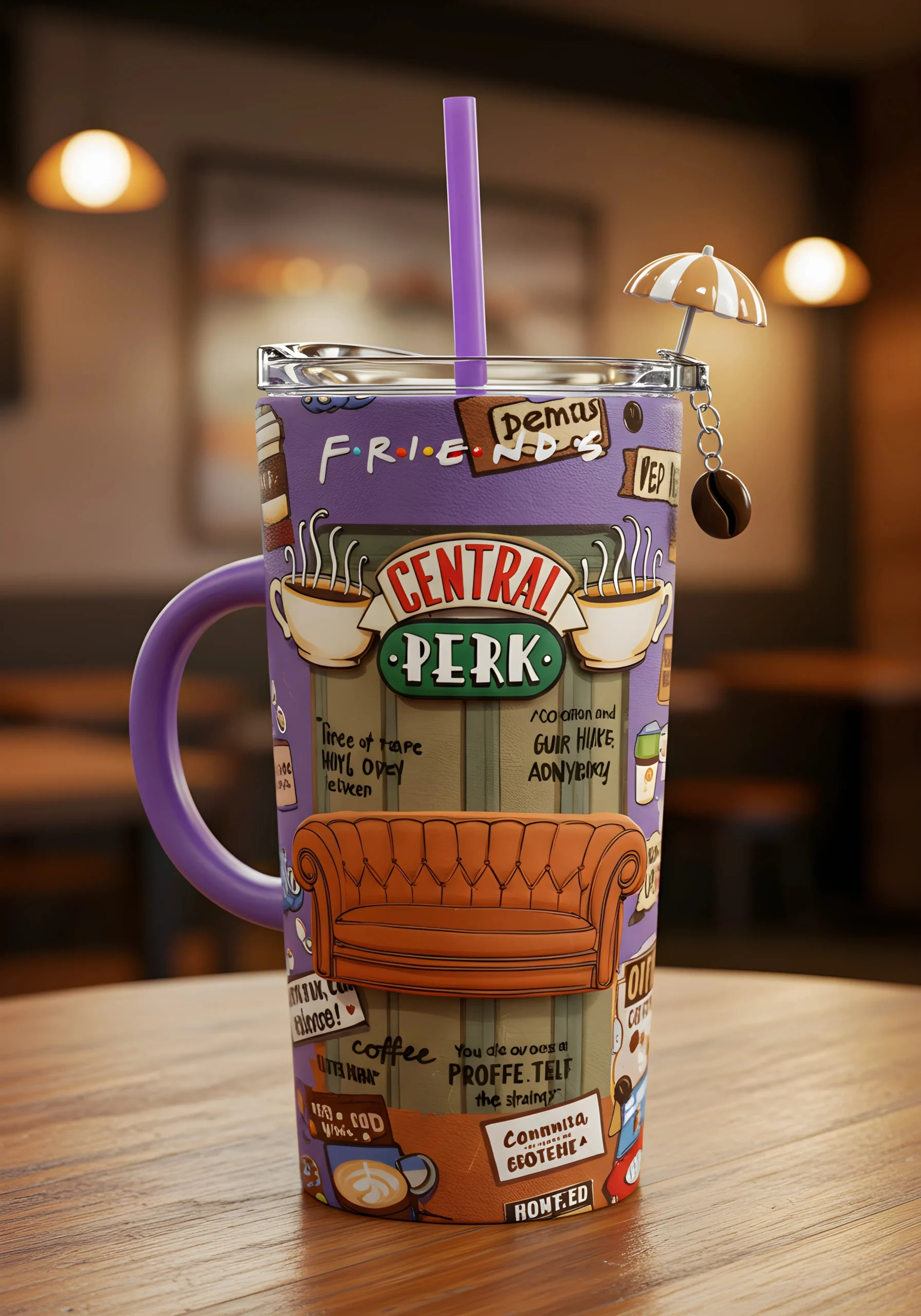 🛋️ Para quem nunca perde um episódio de Friends, o Copo Térmico Central Perk é mais que um item – é uma homenagem. Com ilustrações do sofá icônico, frases da série e um pingente de guarda-chuvinha, ele traz todo o humor e aconchego da série para o seu dia. 📺